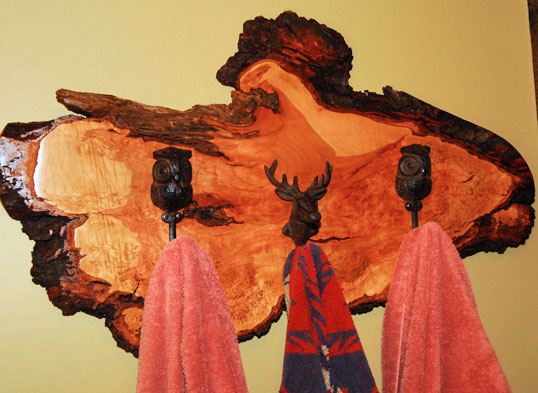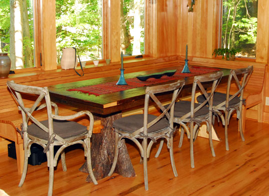 Custom Dining Room Table. Reclaimed wood top. Tree-stump base with a solid oak built in seat reminiscent of a park bench.